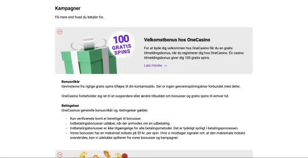 Vores startpakke er bygget i to dele. Først kan nye spillere modtage 100 free spins ved registrering. Derefter giver indbetalingsbonussen 100% op til 200 DKK, med en minimumsindbetaling på 100 DKK. Det gør åbningstilbuddet nemt at forstå for spillere, der sammenligner vilkår for Onecasino bonus med andre lokale muligheder.