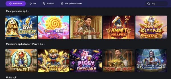 Onecasino tilbyder 1050 spil på tværs af de vigtigste kategorier, så spillere kan skifte mellem forskellige spiltyper uden at forlade én konto. Vores softwarepartnere inkluderer NetEnt, Play'n GO, Pragmatic Play, Evolution, Thunderkick, Quickspin, Yggdrasil, Red Tiger, Nolimit City og Greentube. Den blanding giver et bredt katalog med både velkendte navne og mere nicheprægede udgivelser. RTP-værdier vises i informationspanelet for hvert spil, hvilket hjælper spillere med at sammenligne titler, før de går i gang.